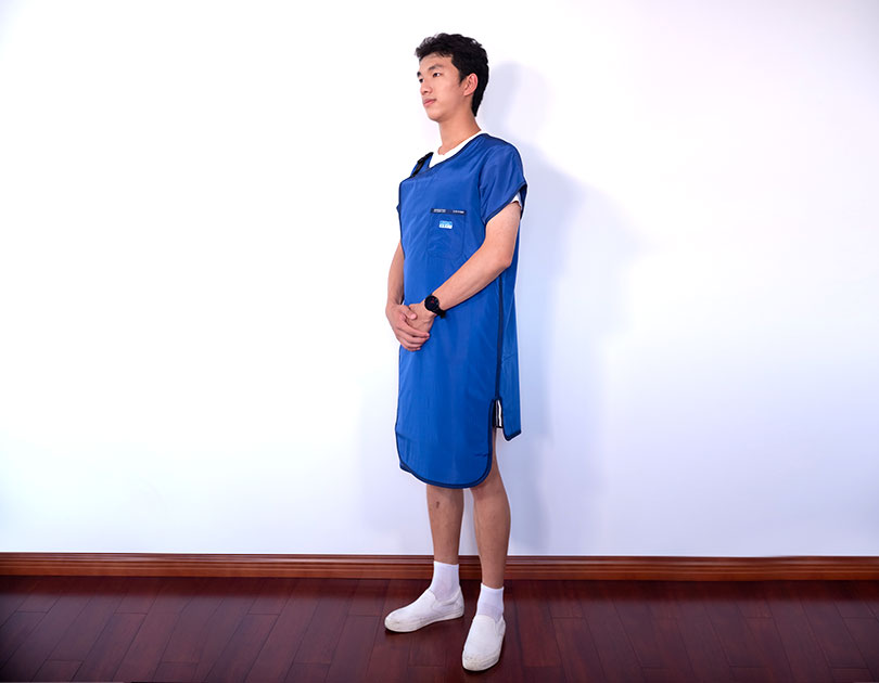 鉛衣分單面鉛衣、雙面鉛衣、分體式和連體式,包括:無袖、半袖、長袖,長袖,不論拍片還是CT都必須對其他部位進行遮擋。
